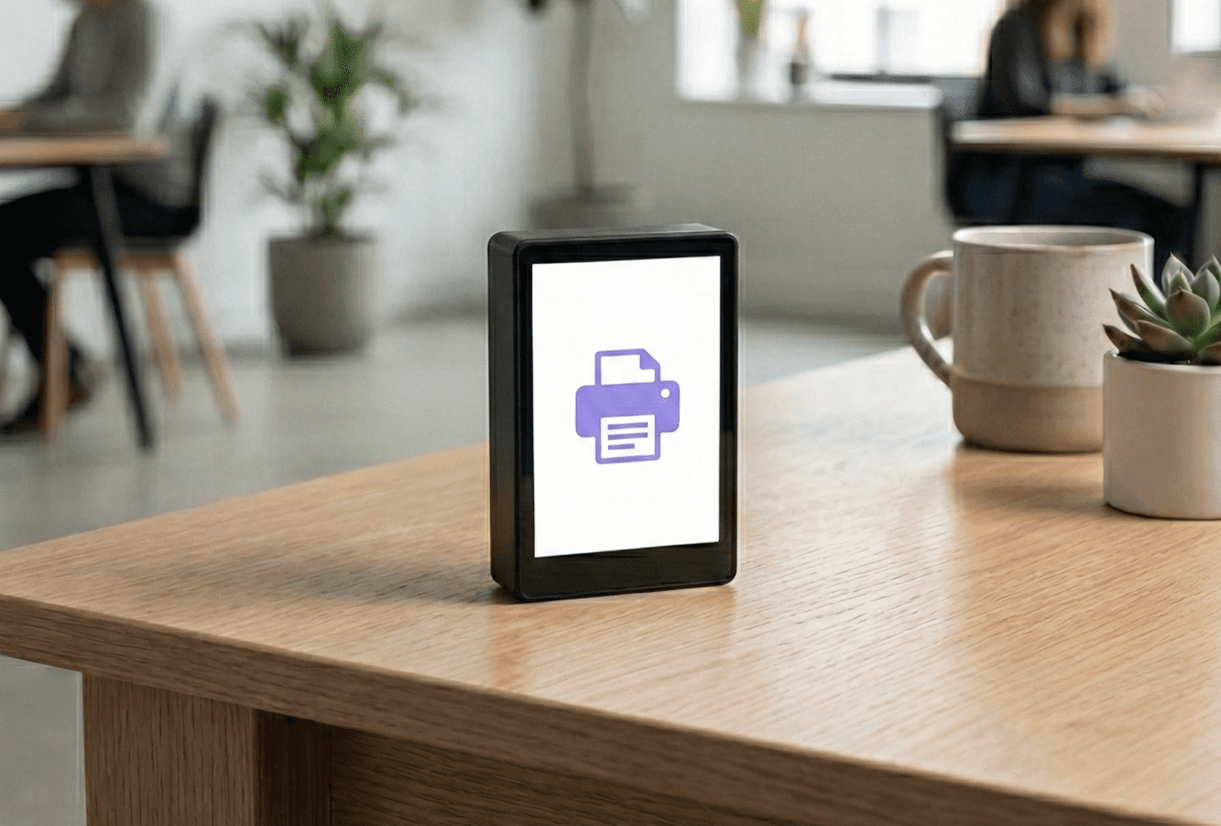 The Deskie Print Server hardware is designed to be a breeze to deploy. Plug in power, plug in Ethernet, and configuration typically takes about ten to fifteen minutes. A small touchscreen on the front displays status information and provides a QR code so setup can be completed directly from a phone.