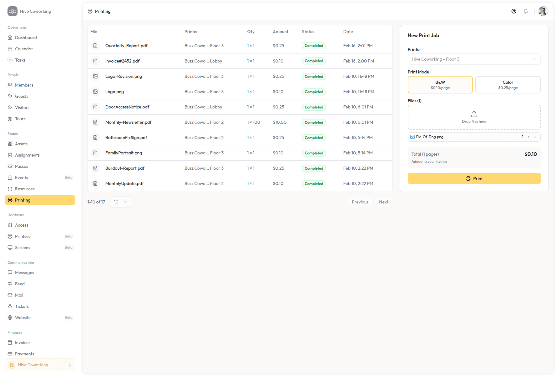 With Deskie Print, members and guests have the ability to print directly from their Deskie workspace. The same place they pay invoices, book conference rooms, communicate with coworkers, manage passes, and access doors is now also where they print.
